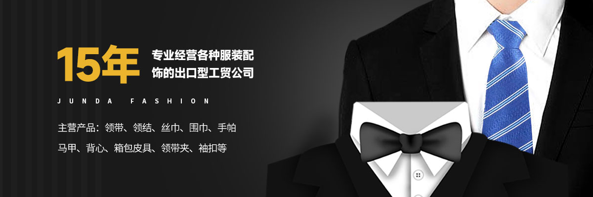 上饒市駿達服飾有限公司是一家專業經營各種服裝配飾的出口型工貿公司,公司多年來致力各種男女服裝國際流行配飾的開發和生產,主要產品為領帶、領結、絲巾、圍巾、手帕、馬甲、背心、箱包皮具、領帶夾、袖扣等,有豐富的內外銷經驗及廣泛的國內外銷售渠道,生產基地管理嚴格,質量過硬,并有一批生產加工企業長期合作